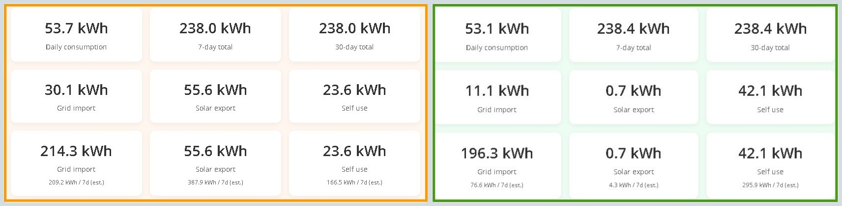 Verkosta ostettava sähkö silloin, kun aurinkotuotanto (ja Talossa B myös akku) ei riitä kattamaan kulutusta.